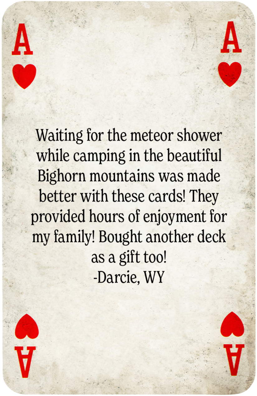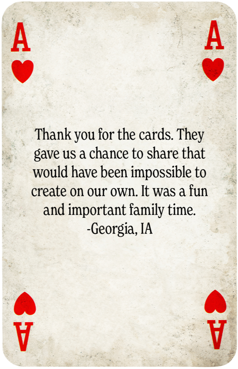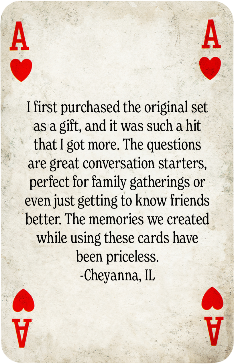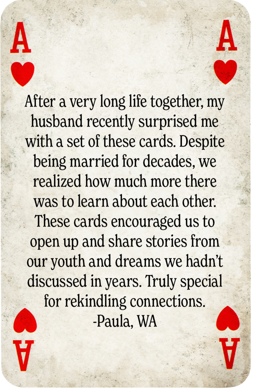 Conversation-starting playing cards for unplugged adventures, deeper connections, and stories that may have otherwise gone unexplored.